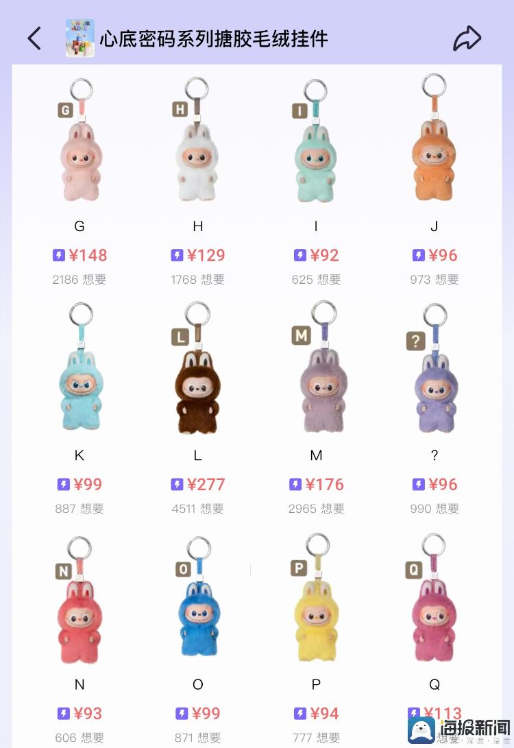 记者从二级市场了解到,目前,该款盲盒出现了价格两极分化的趋势。“L”“R”“M”是全网热度最高的迷你版LABUBU款式,资深玩家小刘告诉记者,“L”款栗子色在全网潮玩平台销量最高,有超过6000人购买,因为该配色曾是LABUBU1.0 系列的隐藏款配色;紧随其后的是黑色的“R”款,因LABUBU首次推出的纯黑配色而备受青睐,“M”款香芋紫配色充满少女感,也是去年的春夏流行色,同样拥有较高人气。而“P”“N”“X”三个款式由于配色常规,在二手交易平台溢价较低,交易量也较少。