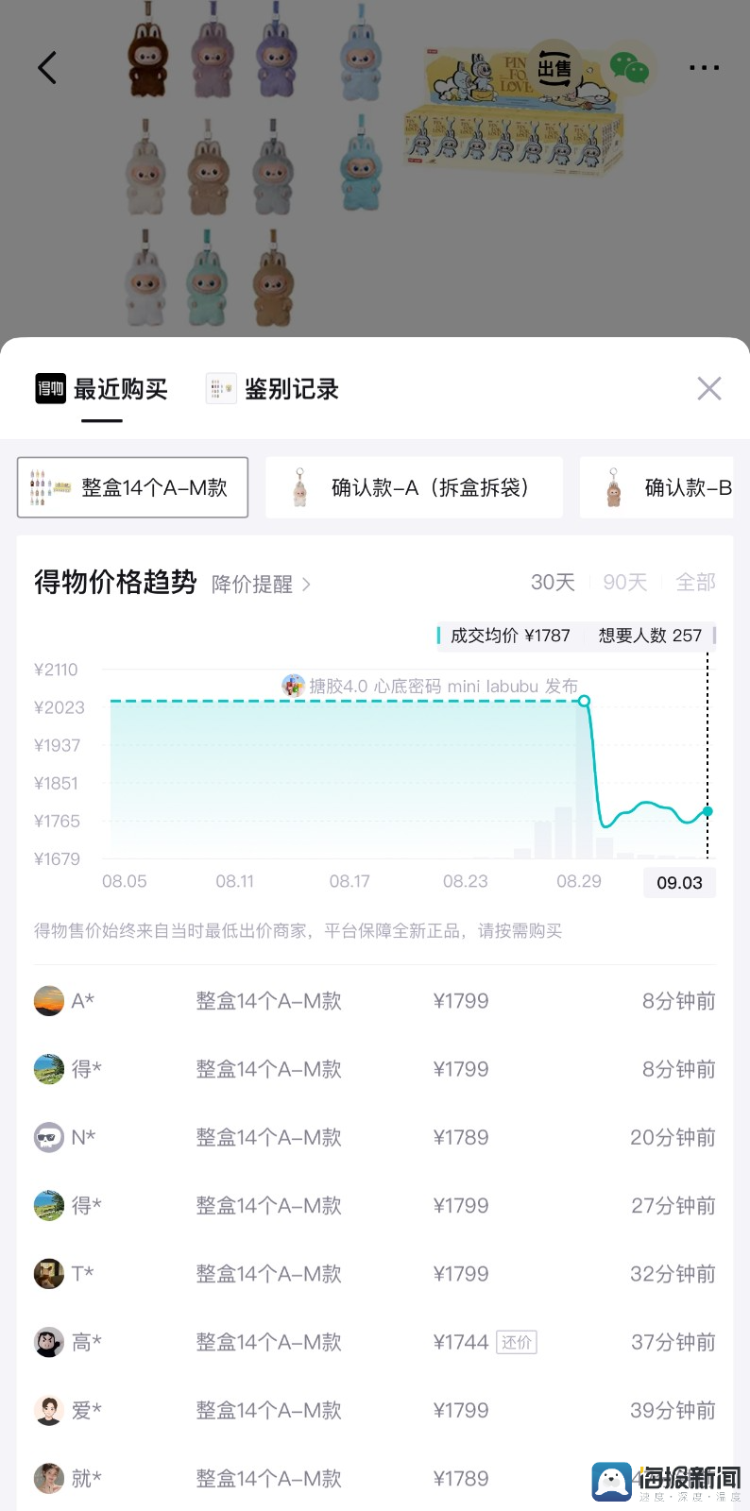 9月4日上午,记者在得物平台发现,未拆盒产品价格降幅较低,以包含14款产品的端盒(A至M)为例,成交价从2036元降低到1781元,下降仅12%,单个未拆盒盲盒成交价下降了22%。但拆盒产品价格降幅较大,即使是稀缺的隐藏款也未能幸免,隐藏款“爱心”成交价从991元降低到702元,降低了29%,最畅销的“L”款价格也下降了近30%。