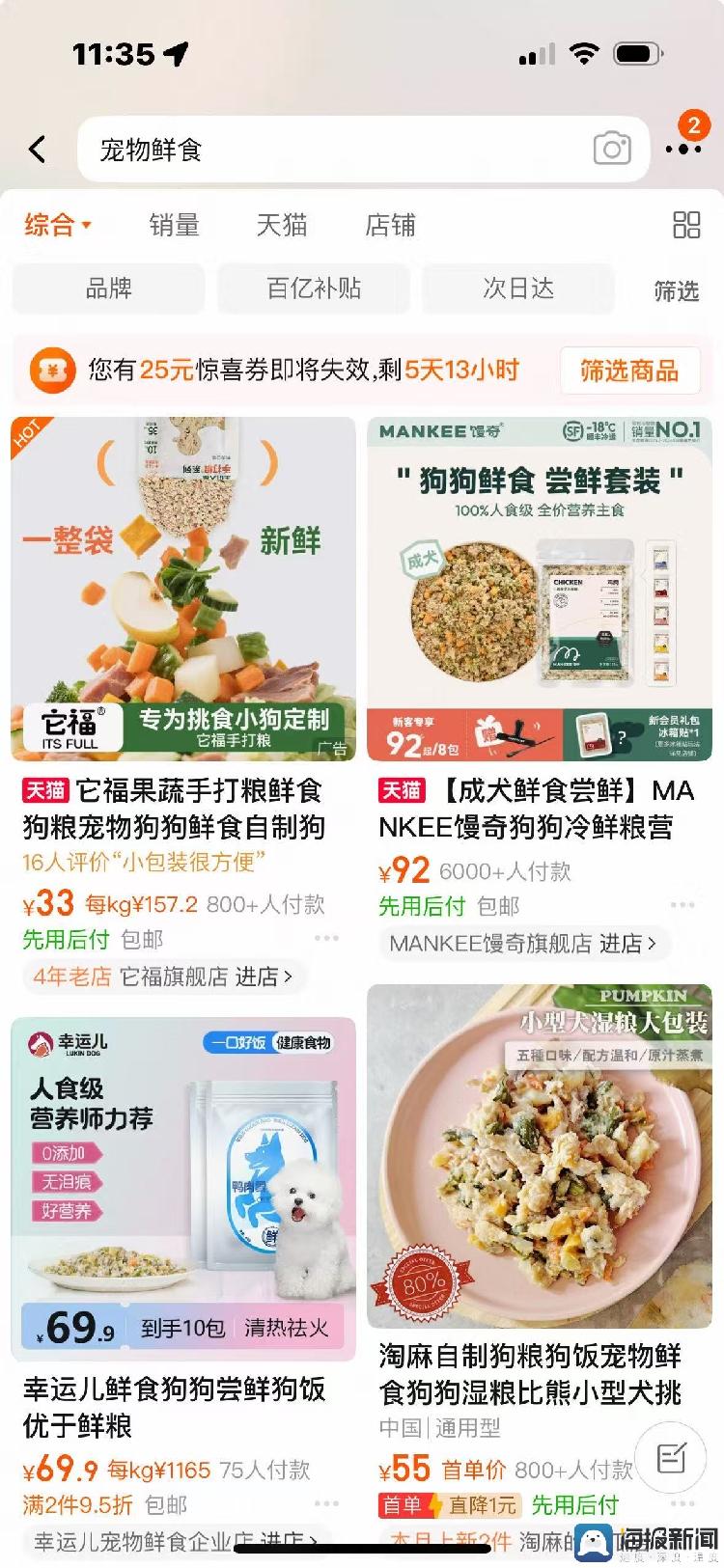 记者以“宠物鲜食”“猫饭”“狗饭”为关键词,在电商和社交平台上搜索,会弹出大量鲜食成品。鲜食因不依赖防腐剂、诱食剂或人工合成营养素,可降低宠物过敏、肥胖等健康问题的风险,受到消费者青睐。