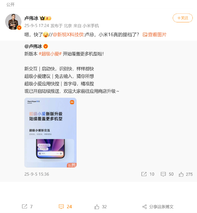 9月5日,小米集团总裁卢伟冰确认小米16提前发布。