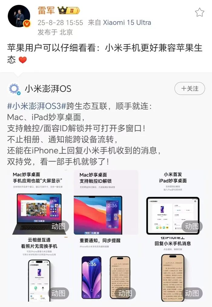 同日,小米集团创始人、董事长兼CEO雷军在社交平台发文称:“苹果用户可以仔细看看:小米手机更好兼容苹果生态。”