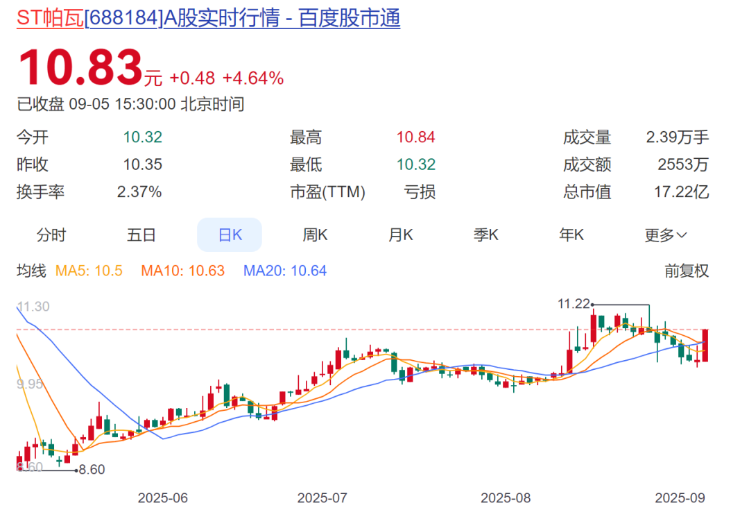 市场方面,ST帕瓦上周报收10.83元,上涨4.64%,最新市值17.22亿元。