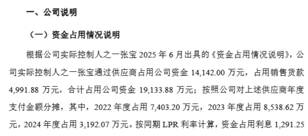 而后,7月13日,ST帕瓦在回复上交所问询函中表示,根据张宝6月出具的《资金占用情况说明》,张宝通过供应商占用公司资金1.4亿元,占用销售货款4991.88万元,合计占用公司资金本金1.91亿元。按照公司对上述供应商年度支付金额分摊,其中2022年度占用7403.2万元,2023年度占用8538.62万元,2024年度占用3192.07万元。按同期LPR利率计算,资金占用利息91.25万元。上述占用资金本金及利息合计2.04亿元。