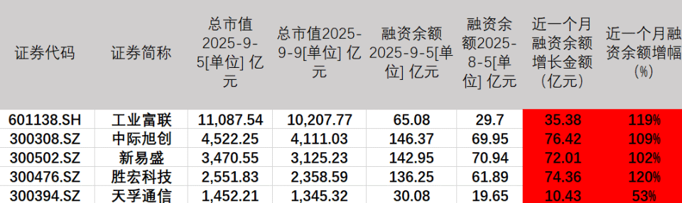 数据显示,近一个月,中际旭创、新易盛、胜宏科技的融资余额均是翻倍式增长,金额均超70亿元;工业富联的融资余额增长35.38亿元或119%。可以说杠杆资金是AI硬件近一个月暴涨的主要推手。