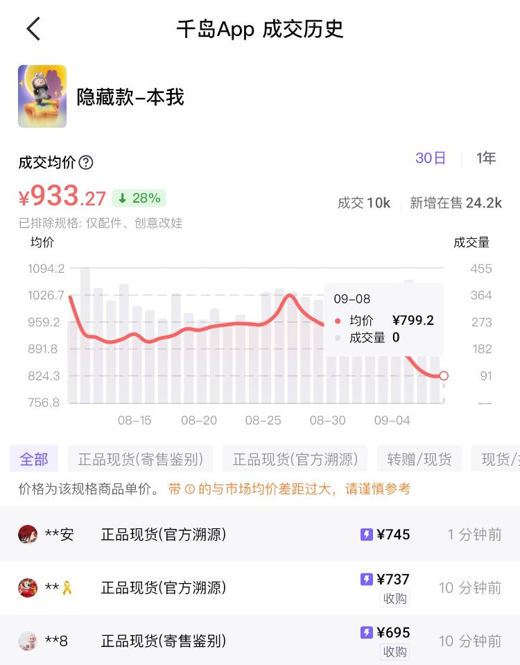 随后,虽有多次上新,拉布布的价格“泡沫”逐步破灭,最高被炒至2987.6元的整组LABUBU3.0系列,9月9日692.7元即可得到,二级市场出现大量抛售情况,跌幅超过76.8%;曾被炒至近5000元的隐藏款“本我”,目前降至700余元,跌幅近86%,距离“骨折价”近在咫尺。