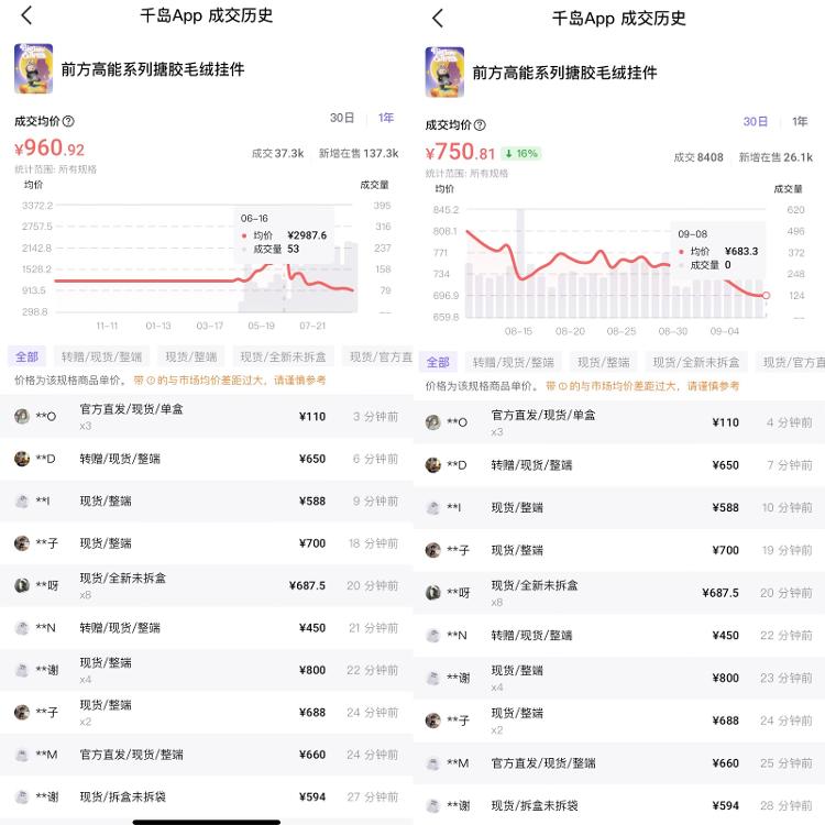 市场对这次补货的反应极为迅速,千岛APP数据显示,补货后,LABUBU3.0整盒成交价逐渐暴跌45%至60%,抛售价格从2100元至2987.6元断崖式跌至1000元左右。隐藏款“本我”从4621元高位骤降至2048元至2851元之间。普通款价格崩塌更为惨烈,以“忠诚”款为例,其成交均价从341元直线跌落至120元左右,近乎“腰斩”。这场价格雪崩不仅让黄牛们损失惨重,也让众多跟风投资的消费者尝到了苦头。
