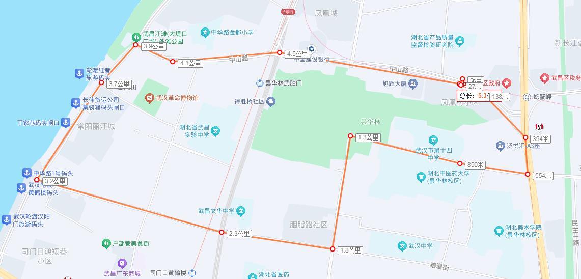 微公交19路:首末站由凤凰山停车场至凤凰山停车场,线路走向:中山路、昙华林、胭脂路、粮道街、临江大道、中华路、临江大道、中山路。全程线长5.3公里。