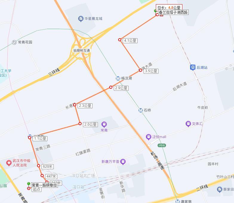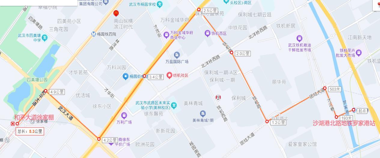 微公交16路:首末站由沙湖港北路地铁罗家港站至和平大道徐家棚,线路走向:沙湖港北路经才汇巷、团结大道、铁机路、友谊大道、徐东大街、和平大道,单程线长5.3公里。