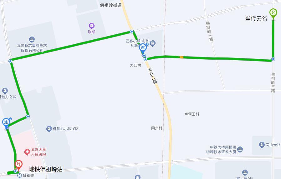 微公交13路:首末站由佛祖岭三路高新六路至高新六路佛祖岭,线路走向:佛祖岭三路、港边田一路、光谷二路、中芯一路、店岑路、高新六路,单程线长5.9公里。