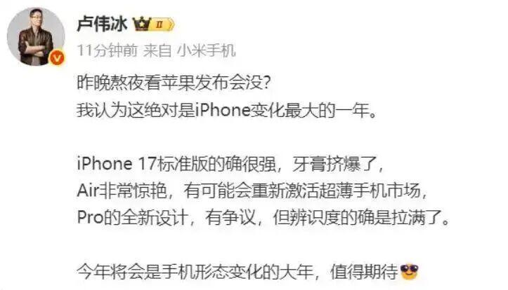 9月10日凌晨,苹果正式发布iPhone17/Pro/ProMax、iPhone Air。小米集团合伙人、总裁、手机部总裁、小米品牌总经理卢伟冰发文称,这是iPhone变化最大的一年。他认为iPhone17标准版很强,“牙膏挤爆了”,Air惊艳或激活超薄手机市场,Pro新设计有争议但辨识度高。