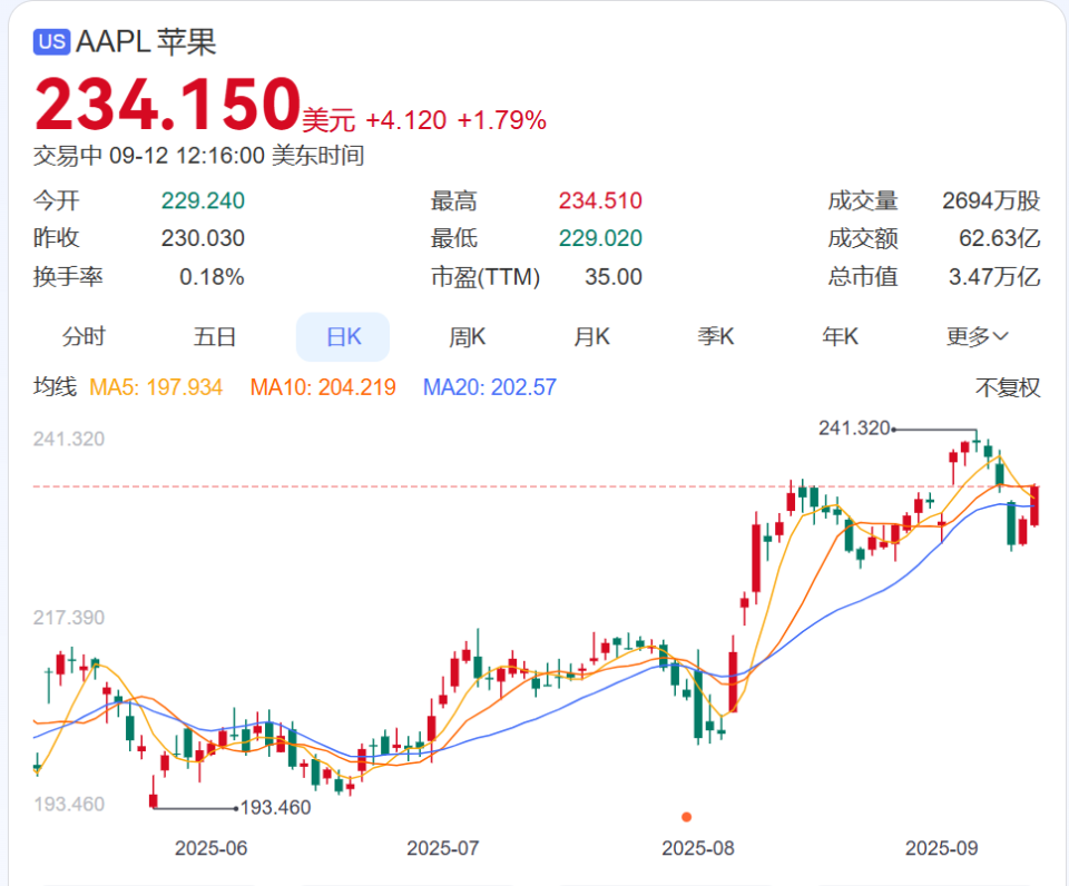 9月12日晚,苹果股价大涨,截至发稿涨近1.8%,报234.15美元,总市值3.47万亿美元。