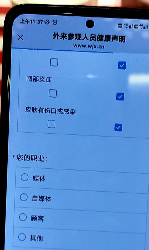 在争议发生后不久,西贝便在公开信中表示,向全社会开放后厨参观。对此,该名服务员也向记者确认了此事。她告诉记者,需要参观后厨的消费者,需要填写一份“外来参观人员健康声明”。记者看到,该声明中还专门列出了参观者是否有传染性疾病、咽部炎症、伤口或感染等条目,还要确认是否有健康证明。