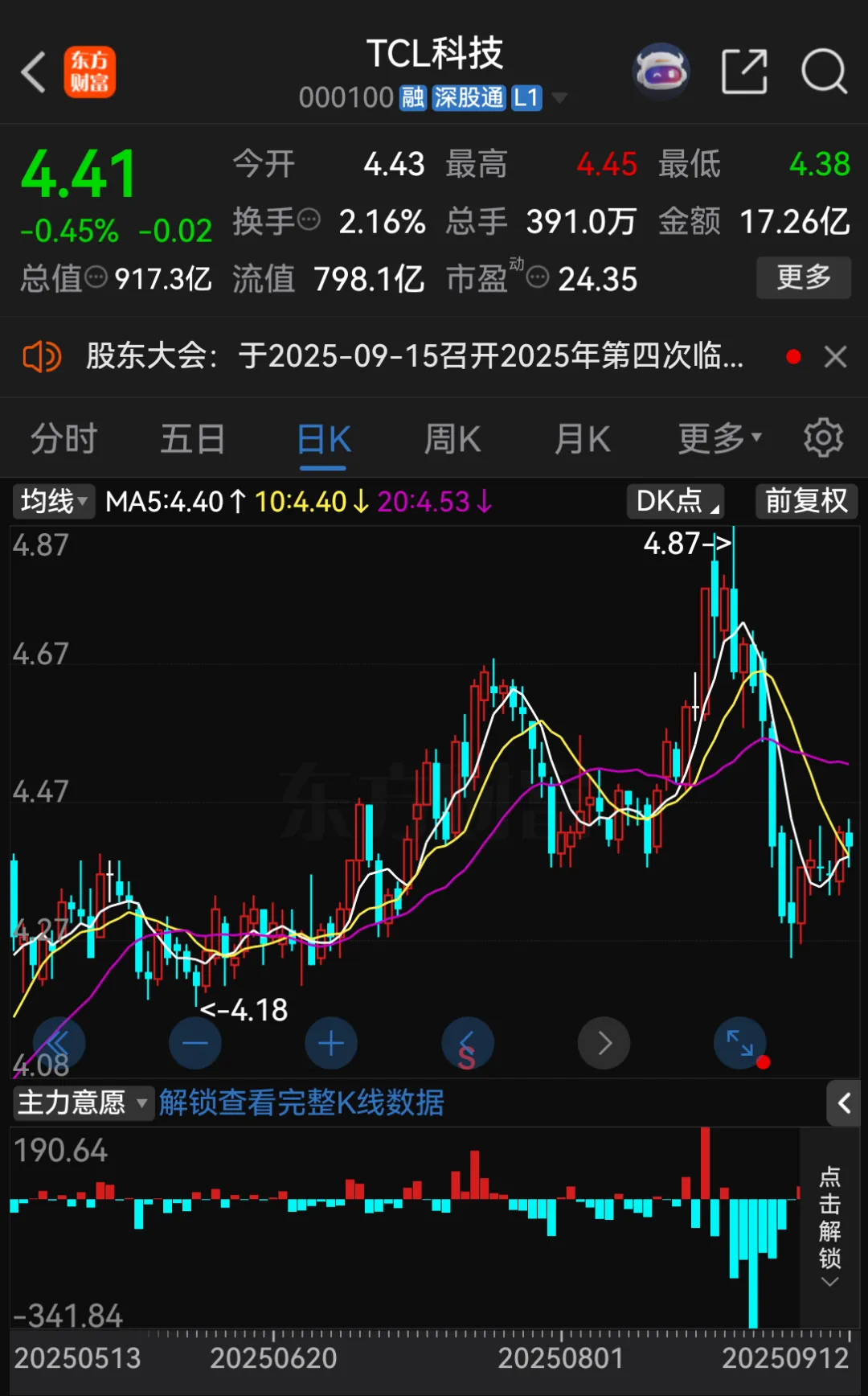 截至9月12日收盘,TCL科技股价报4.41元/股,总市值为917.3亿元。