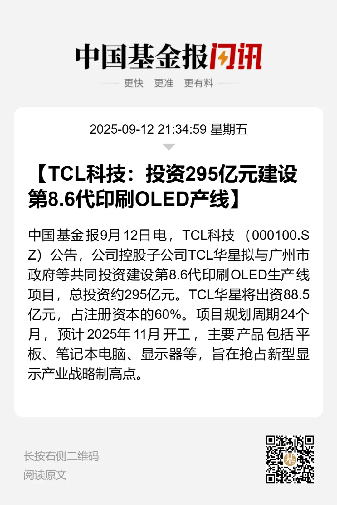 9月12日晚间,TCL科技发布公告称,公司及子公司TCL华星光电技术有限公司(以下简称TCL华星)与广州市人民政府、广州经济技术开发区管理委员会,拟共同出资投建第8.6代印刷OLED(有机发光二极管)显示面板生产线(以下简称t8项目),预计总投资额约295亿元。