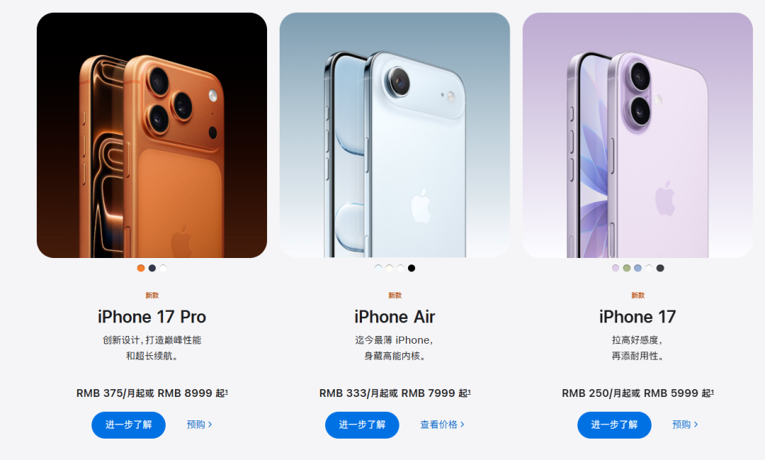iPhone 17:256GB 售价 5099 元、512GB 售价 7099 元;
