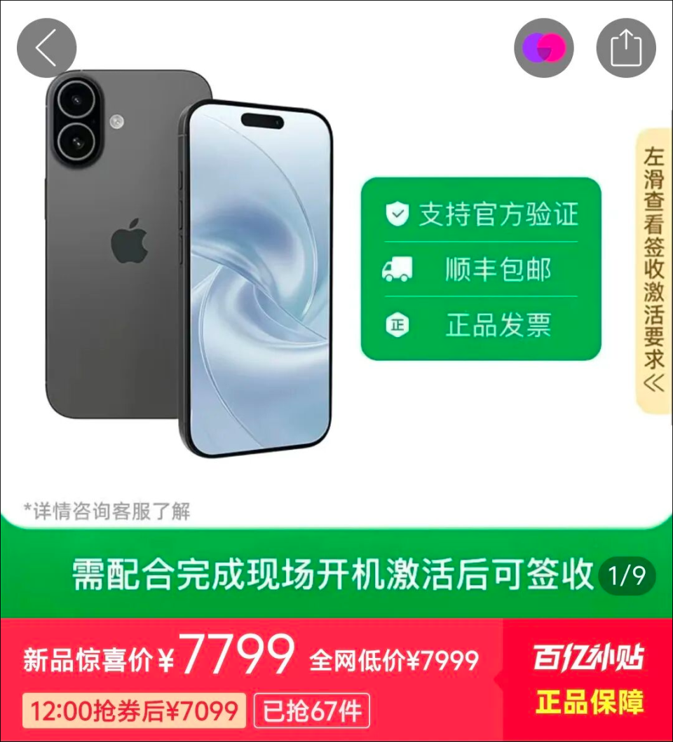 值得一提的是,今年,拼多多新增加了一条限制,iPhone 17系列都需要当面签收开机激活,以避免黄牛套利。