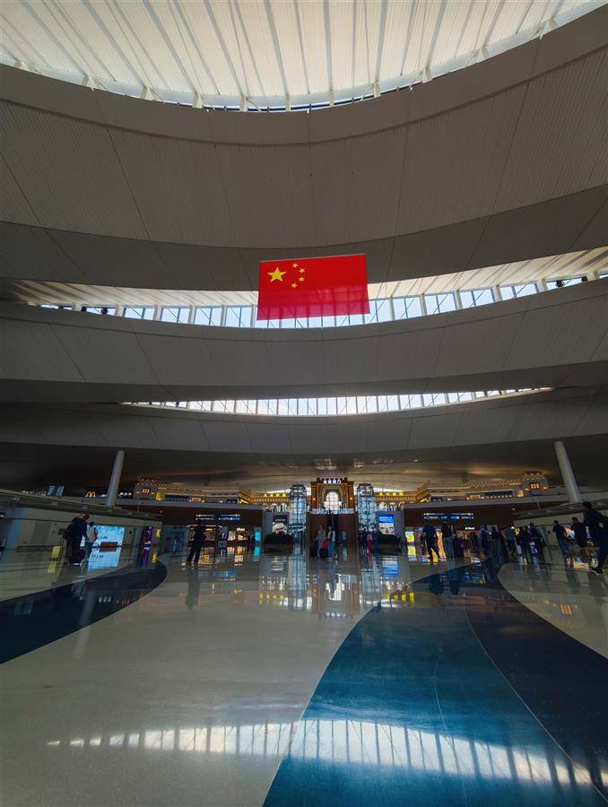 9月15日,当记者走进新疆乌鲁木齐天山国际机场航站楼,随着扶梯上升,五星红旗高悬于穹顶之下,极具丝路风情的金色“丝路国门”出现在眼前。