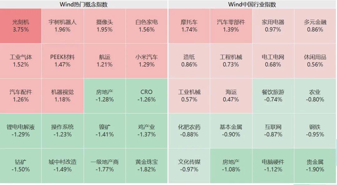 从板块来看,盘初光刻机概念板块拉升,汽车零部件、家用电器、多元金融等板块领涨;而贵金属、房地产等板块出现明显回调,钢铁、文化传媒等相关板块纷纷走低。