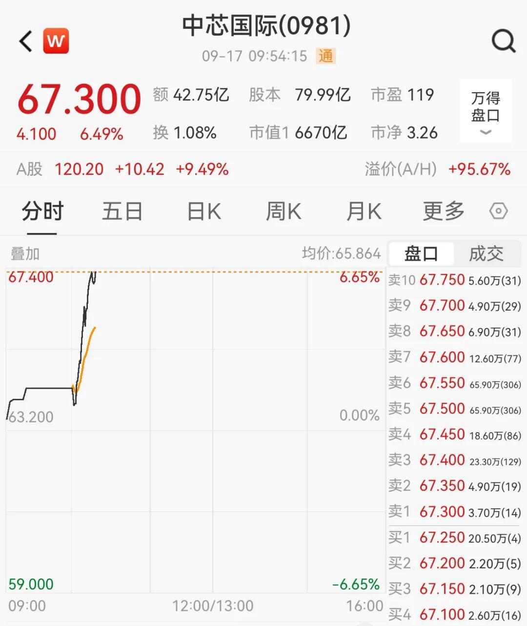 9月17日早盘,中芯国际A股一度涨超10%,中芯国际港股涨逾6%。