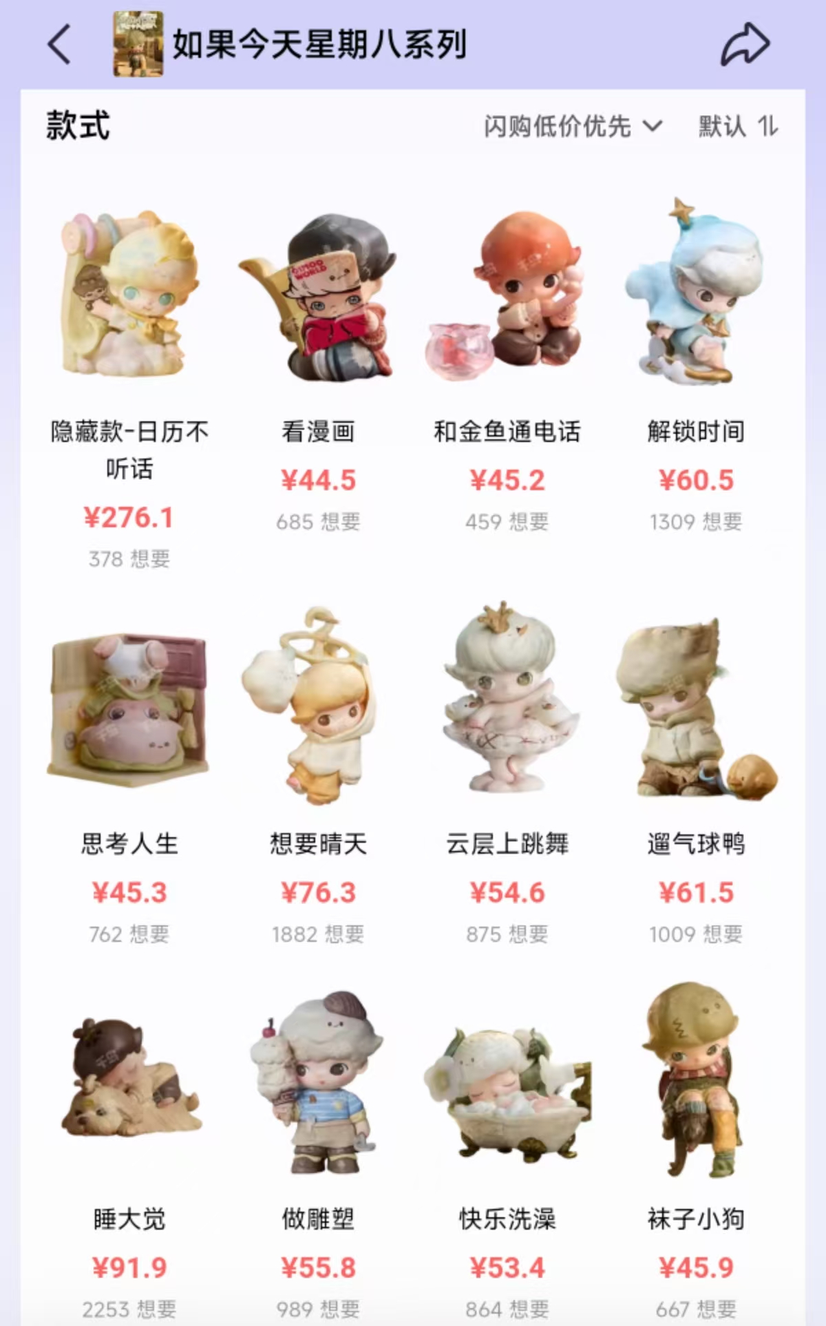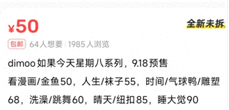 在得物平台,DIMOO“如果今天星期八”系列盲盒目前有894人想要,414人预约抢购。