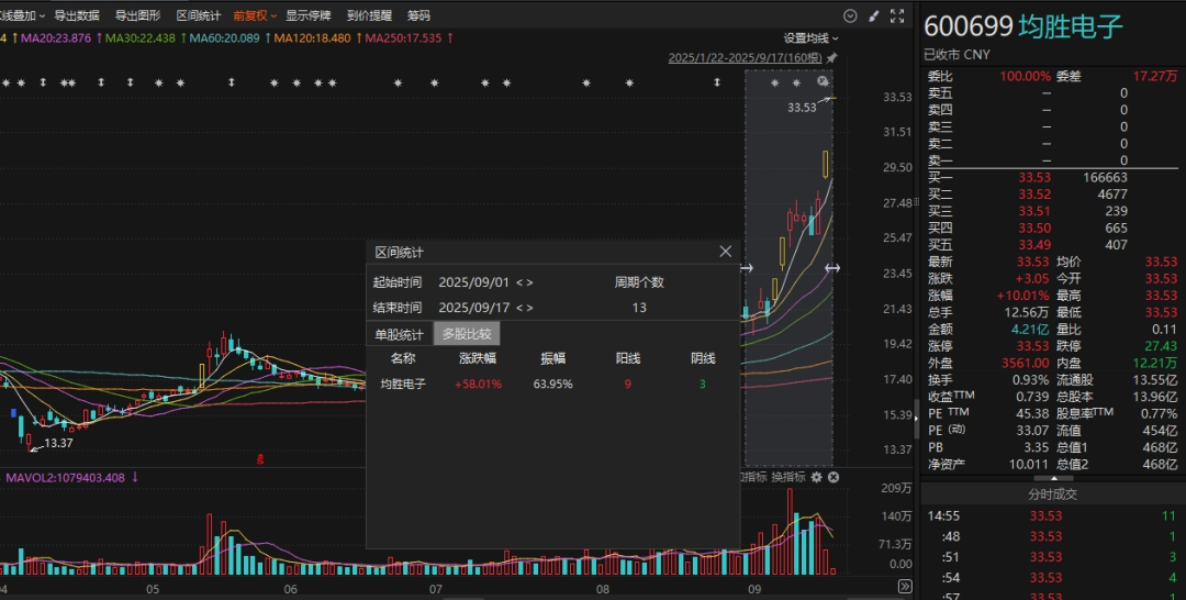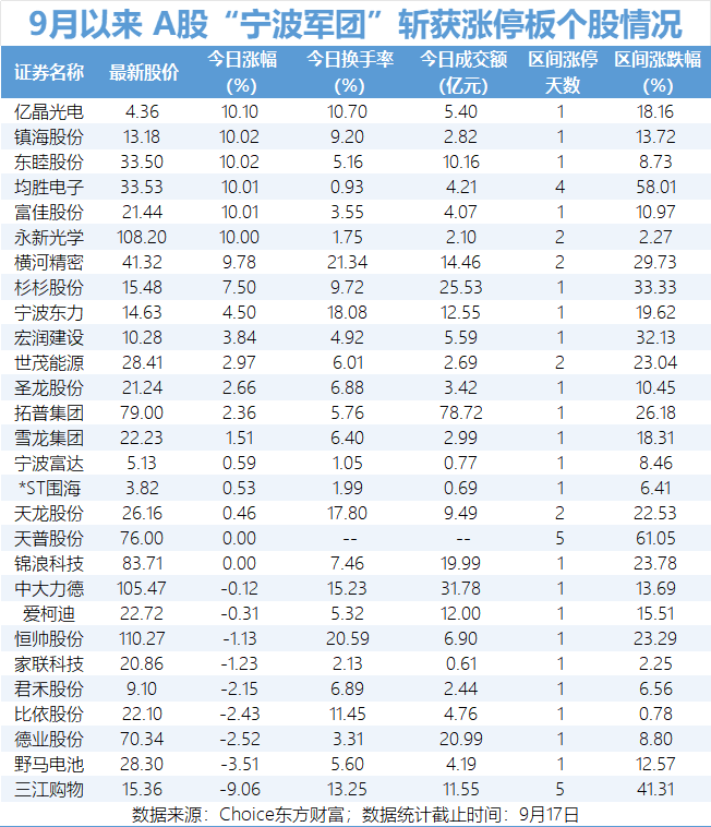 截至9月17日,天普股份连续收获11个涨停板(目前停牌),均胜电子9个交易日斩获4个涨停板,三江购物7个交易日4个涨停板,横河精密9个交易日2个涨停,天龙股份3个交易日2个涨停……