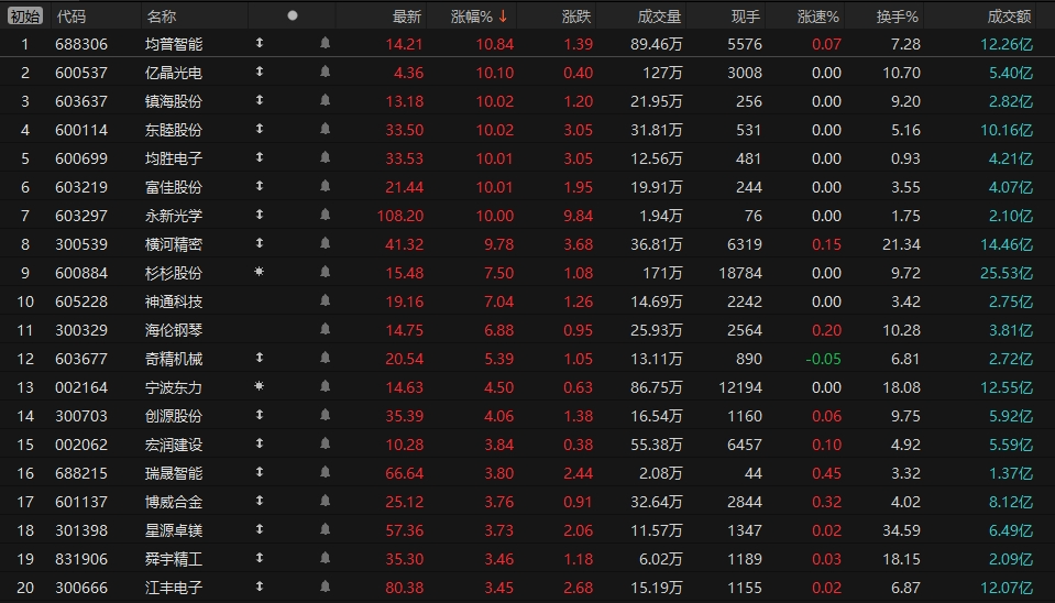 山子高科“四连板”,均胜电子“二连板”,永新光学、亿晶光电“一字”涨停,富佳股份、东睦股份、镇海股份相继封板……