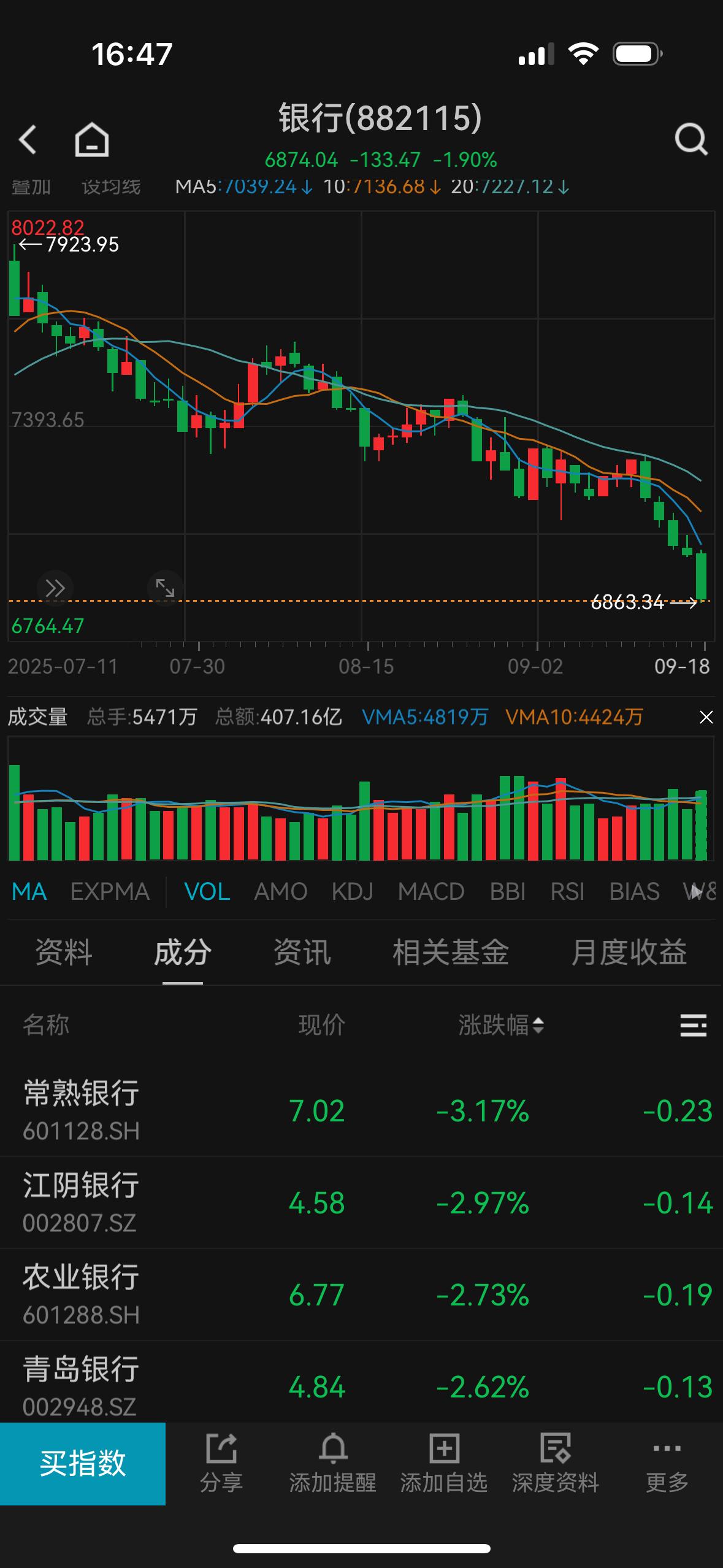 银行板块遭遇连续回调。9月18日,银行股全面下跌,常熟银行大跌3.17%,农业银行、建设银行、工商银行、邮储银行等国有大行都跌超2%。