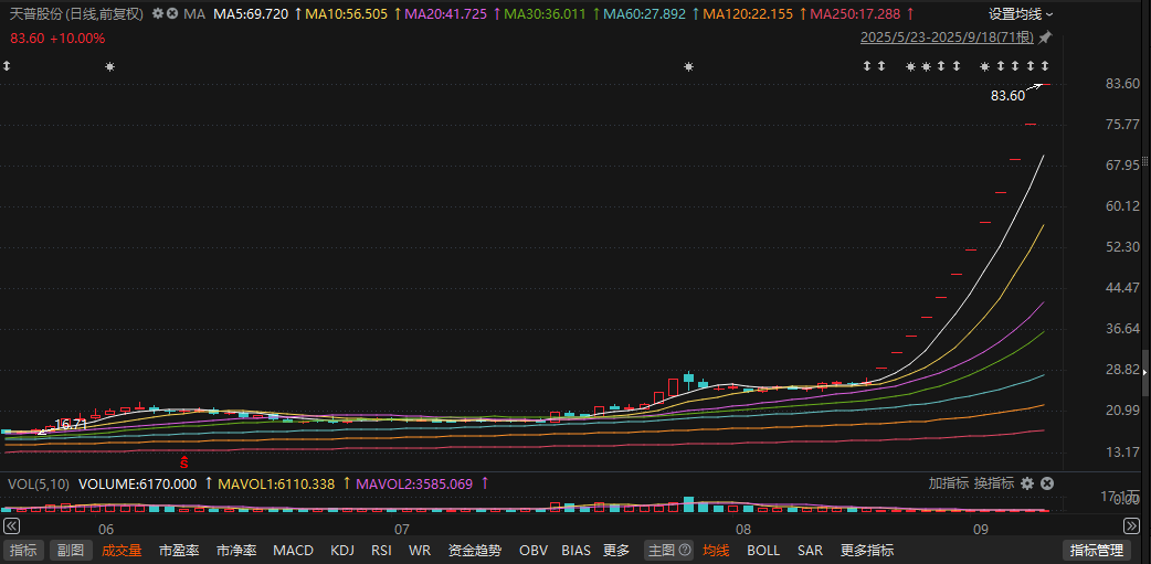截至9月18日收盘,天普股份收涨10%,报收83.6元/股,封单金额高达10.31亿元。从8月22日的收盘价29.3元/股算起,股价涨幅高达185.3%。