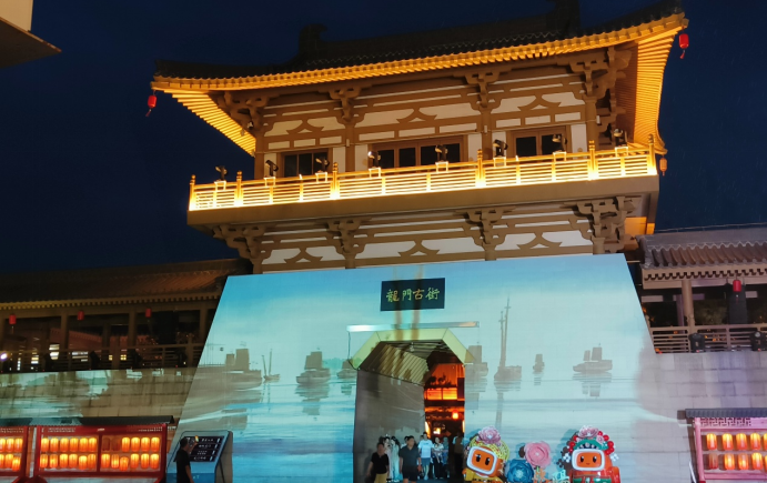 而在距此不远的龙门古街里正在上演着灯光秀,宫殿、山水、游船等画面,让游客仿佛置身于盛唐,颇有“时空对话”的感觉。