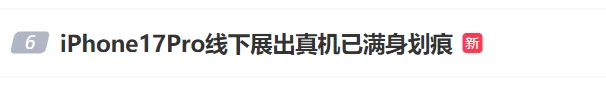 9月19日,iPhone 17系列新机正式开售。首发不久,有第一批拿到新机的网友已开启吐槽模式,在社交平台上称新机刚开箱就出现划痕、凹陷等品控问题。有网友表示,1万多的新机连数据还没传,就发现iPhone 17 Pro银色款边框出现磕痕瑕疵,已联系客服想要换货。有博主晒出店铺内的上手图,早上刚刚展出的新机已经满身划痕,蓝色版本尤为严重。