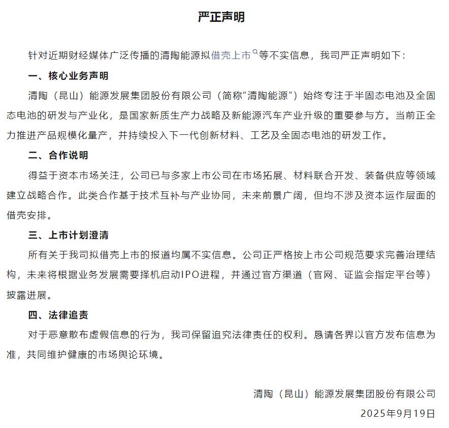 针对近期财经媒体广泛传播的清陶能源拟借壳上市等不实信息,我司严正声明如下: