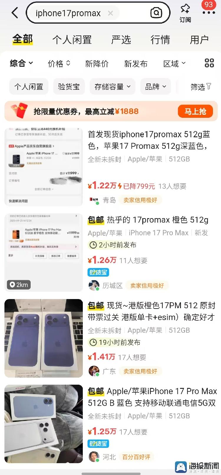闲鱼平台上,多位卖家挂出iPhone 17 Pro Max(512GB)的加价链接,报价普遍在12200元14000元左右,较官网11999元高出200元-2000元。然而,也有网友向记者反映,自己在拼多多购买iPhone 17 Pro(256GB),“只比首发晚一天,便宜将近一千块,手机全新拆封未激活。”