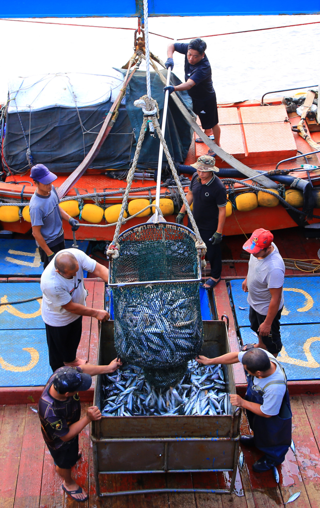 9月21日,捕捞归来的渔船停靠在玉环市大麦屿渔港码头,渔民们正忙将大量海鱼卸载分拣、保鲜运送。拍友段俊利摄