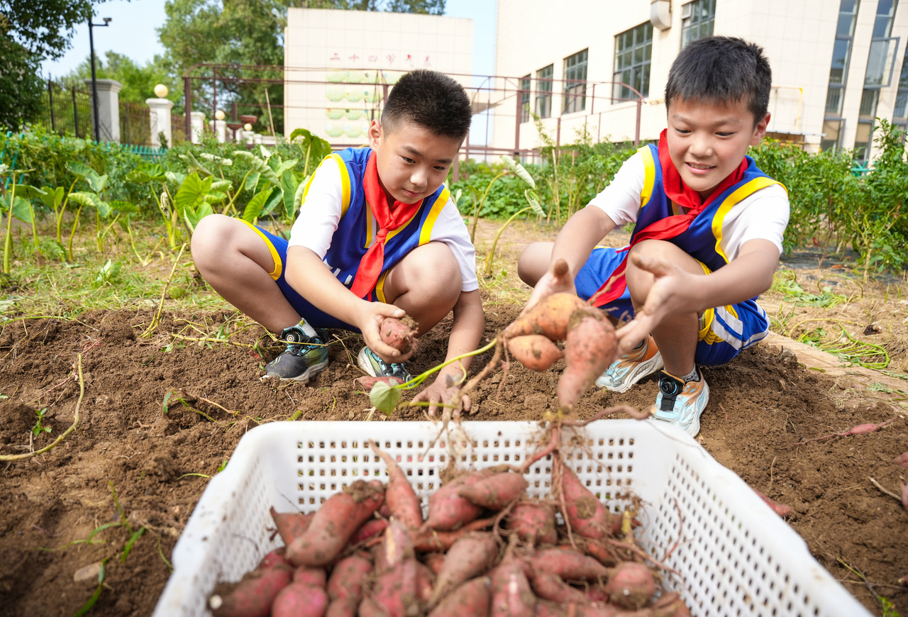9月22日,浙江省湖州市长兴县第五小学,学生在劳动基地采收红薯。拍友陈海伟许扬摄