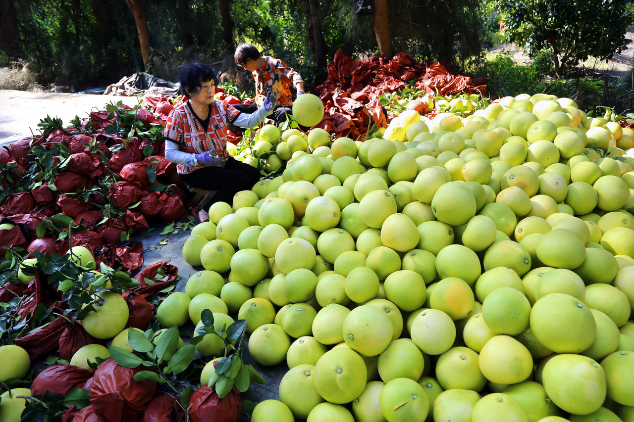 9月8日,玉环市湿地公园的文旦园,果农们在分拣早熟文旦(玉环柚)。拍友吴达夫摄