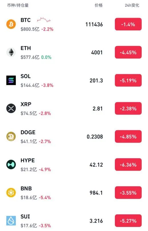 除以太坊之外,当日加密货币市场其他货币也集体大跌,比特币、币安币、狗狗币、SOL币、瑞波币、艾达币、SUI币全线大跌,SOL币、狗狗币、HYPE币、SUI币跌超4%。