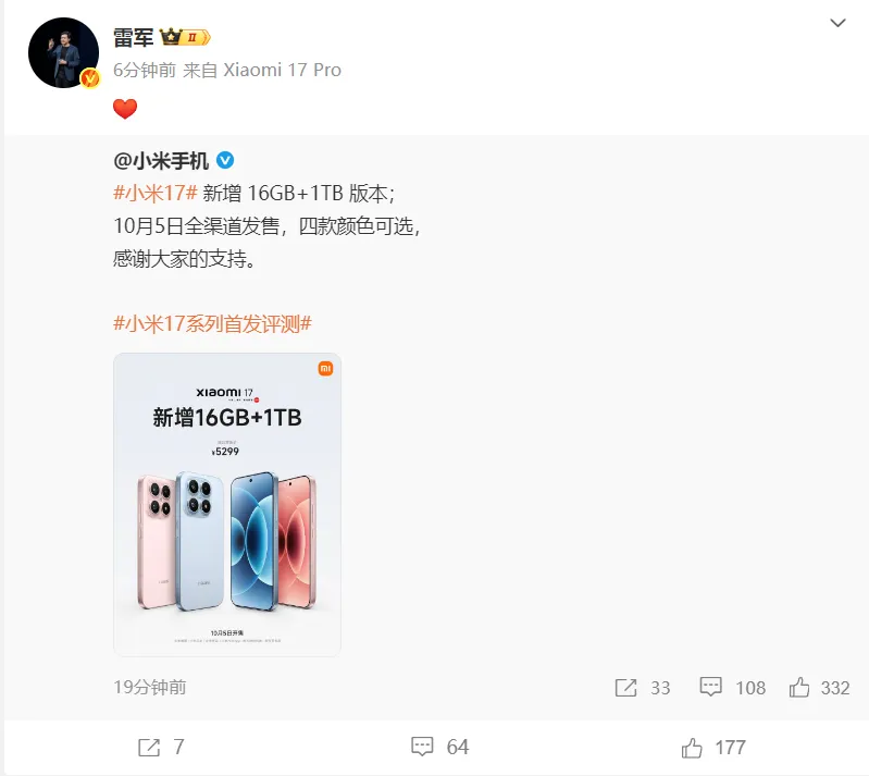 据@小米手机 9月26日消息,小米17新增 16GB+1TB 版本,建议零售价5299元;10月5日全渠道发售,四款颜色可选。随后,雷军转发该消息。
