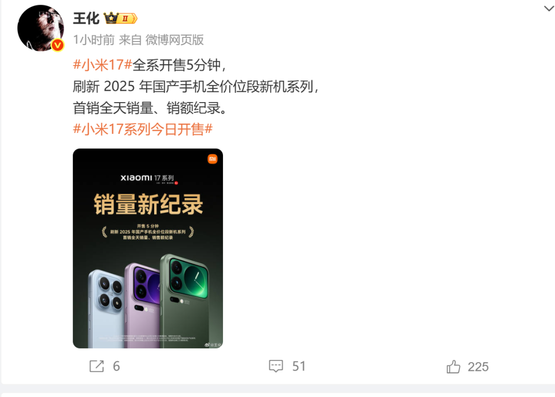 当天上午10时12分,小米集团公关部总经理王化在微博上公开表示,小米17全系开售5分钟,刷新2025年国产手机全价位段新机系列的首销全天销量、销售额纪录。