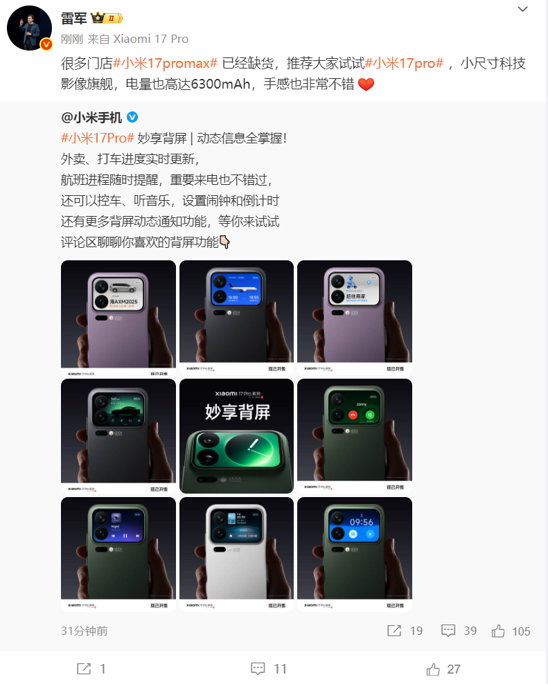 9月28日,小米CEO雷军发文:很多门店小米17promax已经缺货,推荐大家试试小米17pro,小尺寸科技影像旗舰,电量也高达6300mAh,手感也非常不错。