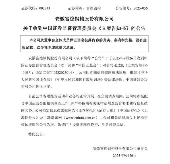 9月26日晚间,富煌钢构(002743)披露公告称,公司于当日收到证监会对公司送达的《立案告知书》,公司因涉嫌信息披露违法违规,证监会决定对公司进行立案。