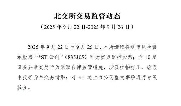 北交所公告,9月22日至9月26日,北交所继续将退市风险警示股票“*ST云创”(835305)列为重点监控股票;对10起证券异常交易行为采取自律监管措施,涉及拉抬打压、虚假申报等异常交易情形;对41起上市公司重大事项进行专项核查。