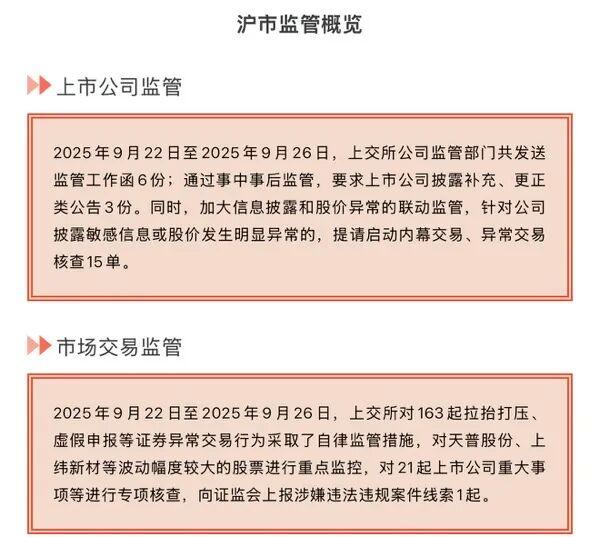 9月26日盘后,上交所发布沪市市场运行情况表示,9月22日至9月26日,上交所对163起拉抬打压、虚假申报等证券异常交易行为采取了自律监管措施,对天普股份、上纬新材等波动幅度较大的股票进行重点监控,对21起上市公司重大事项等进行专项核查,向证监会上报涉嫌违法违规案件线索1起。