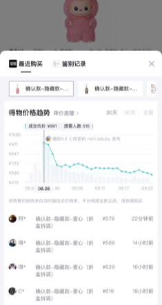 对比“星星人美味时刻”毛绒挂件当前转售市场的溢价,无论是隐藏款,还是整盒价,产品溢价都略高于8月28日发售前的迷你版LABUBU。据记者此前调查,迷你版Labubu发售前,二手市场单组“端盒”(14个整盒购买)价普遍在1600元至200元,相较官方1106元的原价溢价500元到900元左右。但据报道,在正式发售后,该款新品在二手交易市场的价格便一路下跌,有黄牛表示“迷你版Labubu的价格后劲没有第三代Labubu足。”,9月17日,得物APP平台数据显示,迷你版LABUBU价格已大幅回落,单个A-M款成交均价为145元;整盒(14只)N-Z款成交均价为1402元。