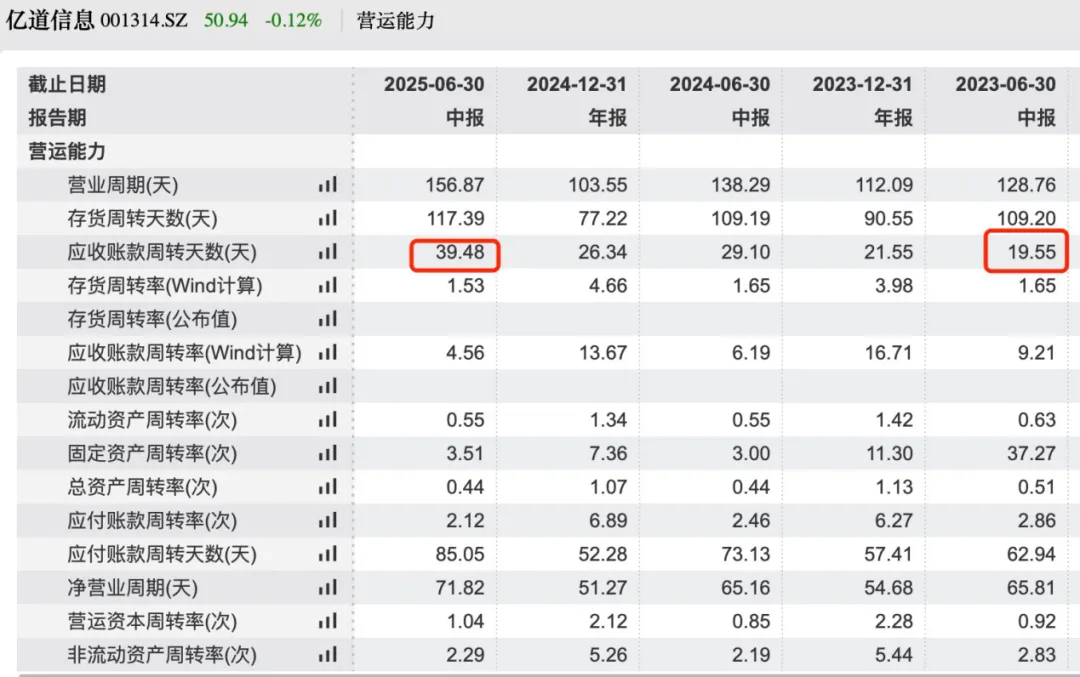 据Wind金融终端显示,自2023年半年度到2025年半年度,亿道信息应收账款周转率从9.21大幅下降至4.56,平均回款时间从19天延长至39天。