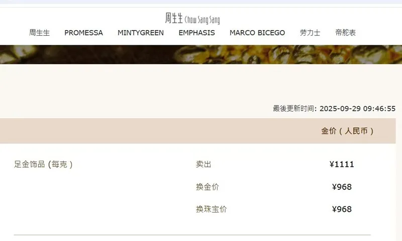 9月29日,国内部分黄金珠宝品牌金饰价格继续上涨。具体来看,周生生足金饰品报价1111元/克,较9月26日上涨5元/克;周大福、六福珠宝、老凤祥等品牌足金首饰价格则维持在1108元/克不变。