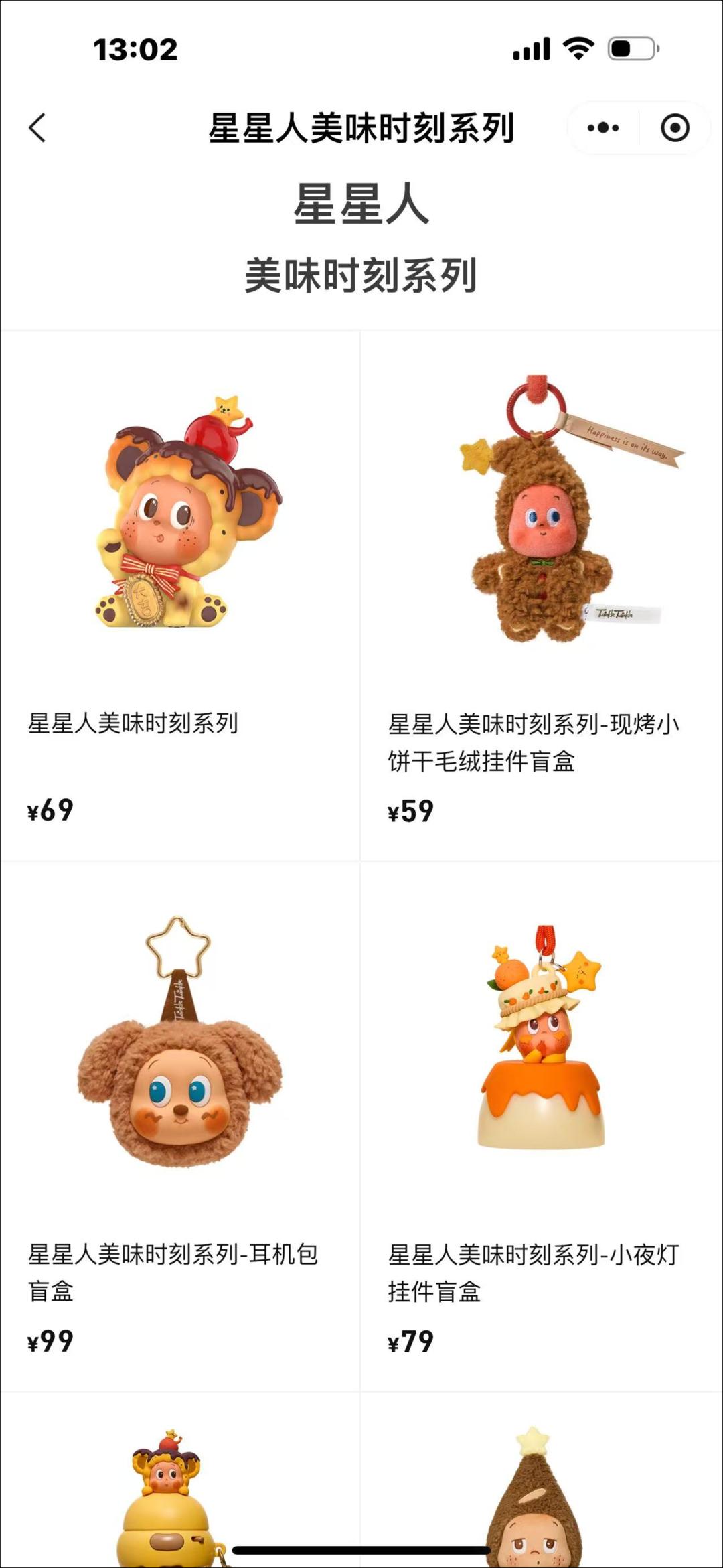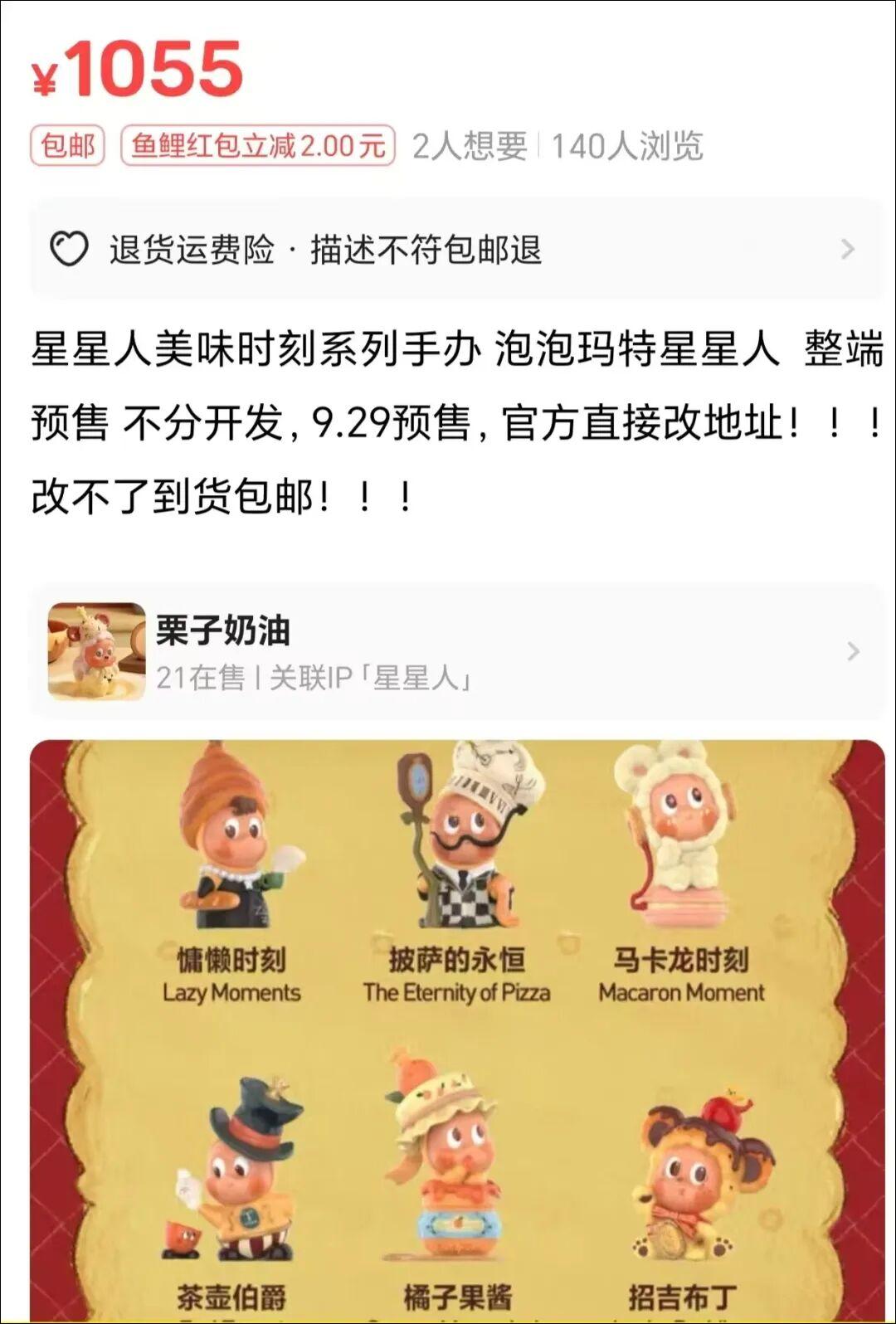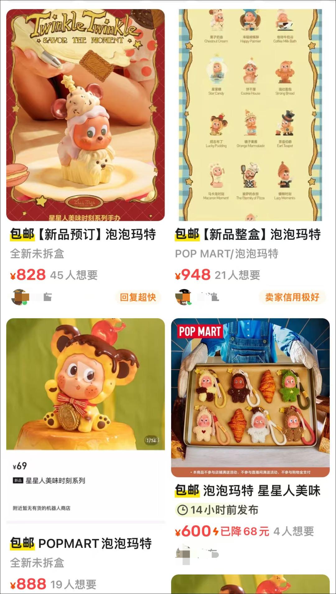 “星星人美味时刻系列”手办也受到追捧,该系列一端12个,外加一个隐藏款。其中,热度较高的有“星星糖”“马卡龙时刻”“招吉布丁”三款。某二手交易平台数据显示,该系列手办一端原价828元,被炒至1055元,溢价27%。