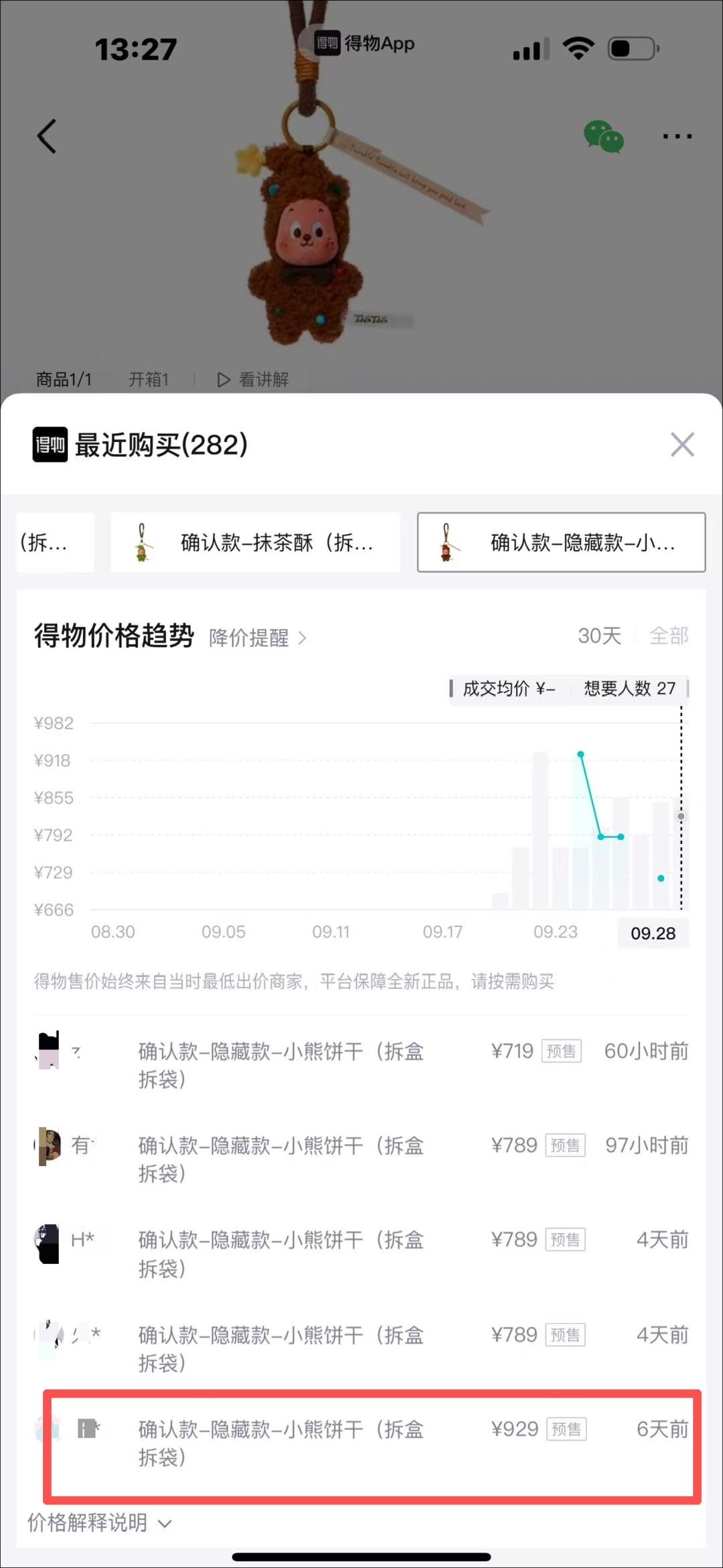 某二手交易平台数据显示,已售出的一端价格均价856元,已有近300人付款。隐藏款“小熊饼干”最高成交价从59元上涨至929元,溢价约15倍。成交热度TOP3分别为“香草脆”“抹茶酥”“咸曲奇”,溢价均超过3.6倍,热度最低的“甜奶油”溢价也达到了3.3倍。