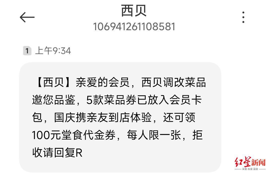 1日上午,不少西贝会员收到“西贝调改菜品邀您品鉴”的短信,称5款菜品券已放入会员卡包,国庆携亲友到店体验,还可领100元堂食代金券。