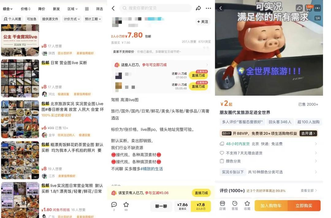 蓝鲸记者搜索发现,目前该服务的市场定价相对较乱——单个定位的收费基本在8-50元左右,实况照片则从3-20元不等,视频价格要再贵些。这些照片大多可以买断,避免与他人重合。代发一般通过登陆买家账号的方式实现,部分卖家支持代发朋友圈、小红书和抖音等多个平台。