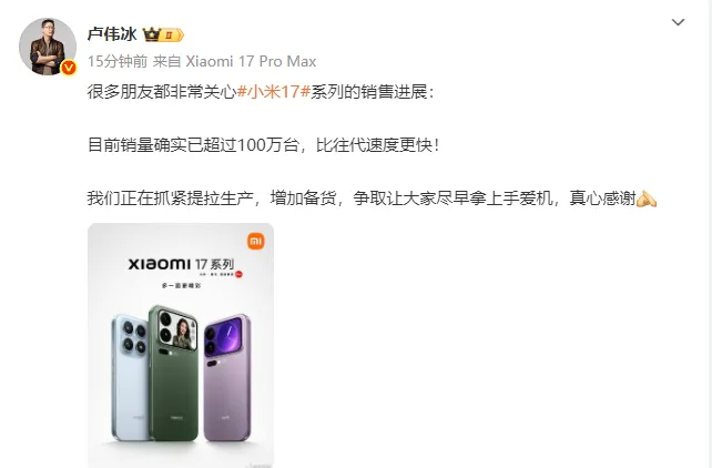 10月2日,小米集团总裁卢伟冰在社交平台发文称,小米17系列目前销量已超过100万台,比往代速度更快,小米正在抓紧提拉生产,增加备货。
